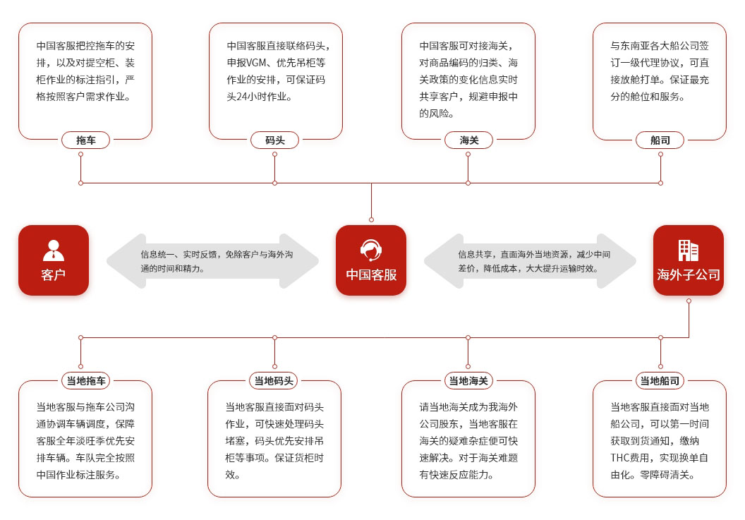 目的港的清关和派送本土化,跳过了当地代理,没有差价。所有当地成本直接面对客人。例如当地港口码头杂费所有费用凭票据实报实销。为广大客户降低了运输成本。。