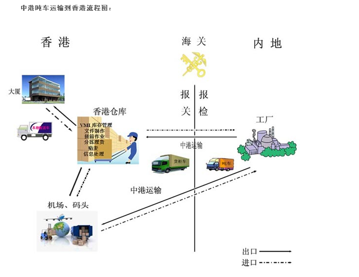 有整车包车运输、和散货,零担、拼车的方式,自由中港运输车队,大陆和香港有2万平方米的仓库,长期服务于工厂、贸易公司,物流同行。全国设有服务网点,提供上门提供,报关,香港仓储,运输,派送为一体的进出口服务 。